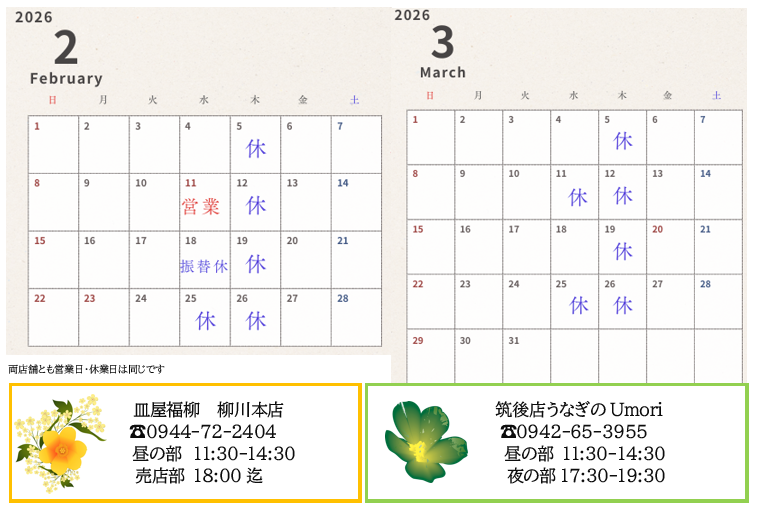 いつも皿屋福柳柳川本店、筑後店うなぎのUmoriをご愛顧いただきまして誠にありがとうございます。2月・3月の営業のおしらせをいたします。2月は祝日に伴いまして一部営業・休業日の振替を行っております。ご不明な点がございましたらお気軽に店舗の方へご連絡をお待ちいたしております。